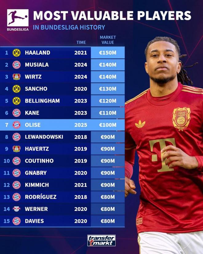 德甲球员德转历史身价榜:哈兰德1.5亿欧最高,奥利塞1亿欧第七